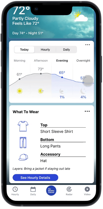 Users check the weather to prepare for the day to know what to expect and how to dress. Offering personalized clothing suggestions based on the weather, streamlines the information in a direct yet informative way to the user.