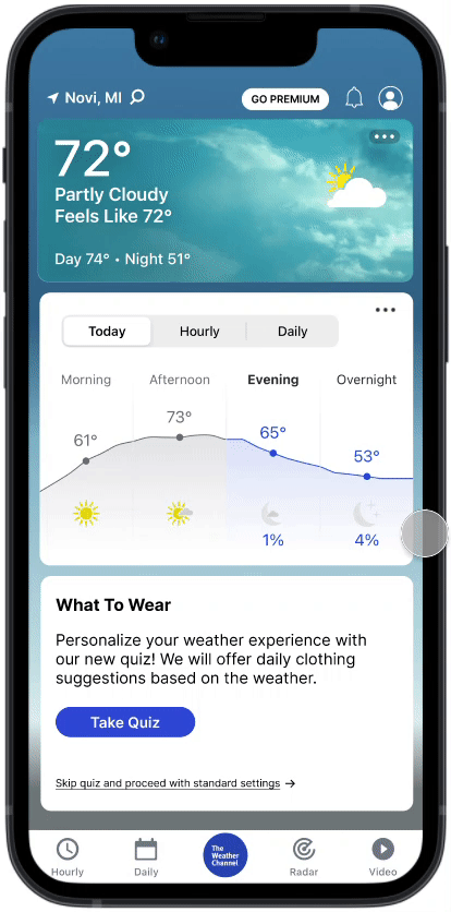 The quiz offers the user an opportunity to personalize their weather experience. If users prefer to skip the quiz, there is an option for standard settings.